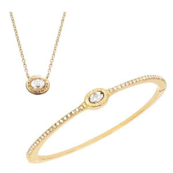 COACH Signature Pendant and Bracelet 2-piece jewelry set includes a glistening pave hinged bangle bracelet featuring sparkly stone at front adorned and a coordinating pendant. Both with COACH engraved signature logo on the outer edge. Each piece features an oval-shaped crystals as the centerpiece. Detailed with COACH engraved Signature logo on the outer edge. The necklace has an adjustable lobster clasp closure. Hinged bangle bracelet offers easy on off, one size fits most styling. Includes COACH pouch for each piece.